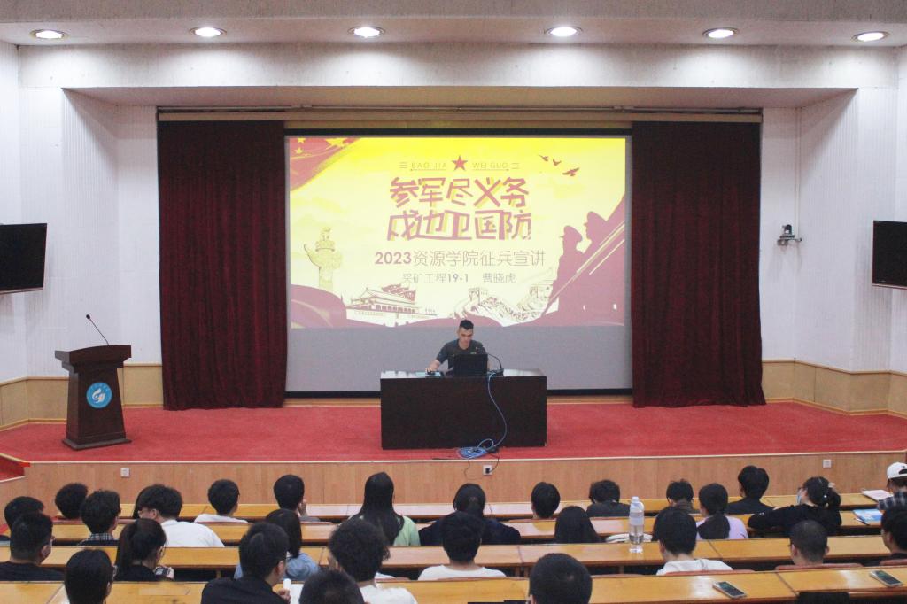 在4号楼报告厅举办“参军尽义务 戍边卫国防”宣讲会。2023届退役复学、考研上岸优秀毕业生曹晓虎主讲,学院2023届、2024届全体毕业生参加。