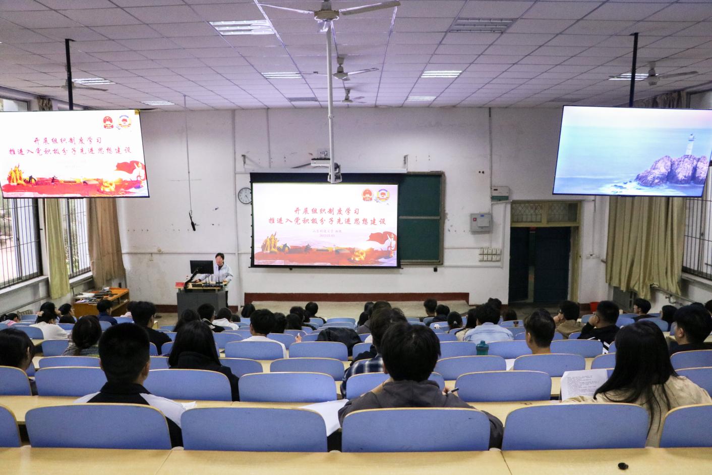 学工办主任、团委书记、第四党支部书记洒艳在1A107为入党积极分子讲授“中国共产党党徽党旗条例”与“开展组织制度学习推进入党积极分子先进思想建设”专题党课。