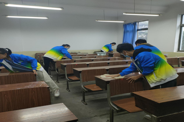 参加活动的人员于活动当天上午8:40在学校文化广场集合并分配活动任务,随后队长发放活动中所需物品。各小组长带领成员去各自的活动区域,各小组用自己携带的盆、桶和抹布等工具对课桌上的涂抹等痕迹进行了认真的擦拭,为确保任务的圆满完成,反复进行检查,每张课桌均需擦拭多次。最后,各小组在教学楼门前集合,相关人员收回剩余物品,由相关人员验收成果。