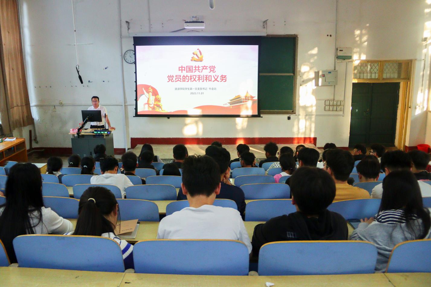 学生第一党支部书记、辅导员牛会功在1A107为入党积极分子讲授“中国共产党党员的权利和义务”专题党课。
