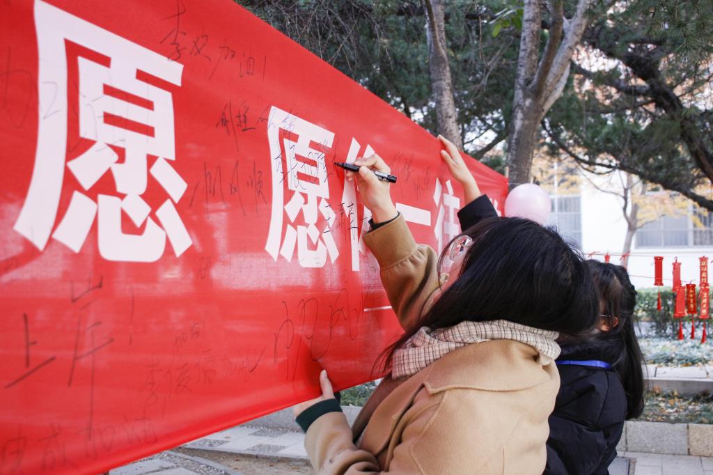 对考研学子的深切关怀与期望。活动前,学院组织人员悬挂条幅,确保悬挂平整、美观。活动中,学院领导与辅导员以笔笺情,在条幅上写下殷殷期盼;学弟学妹们也纷纷在条幅上签字留念,传递对学长学姐们的真挚祝福;考研学子纷纷拍照留念,深受振奋与鼓舞。