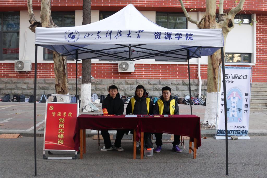 学生会工作人员提前布置好桌椅与展板,准备好听力专用耳机、电池、涂卡笔、橡皮等考试必需用品,为考生提供出借服务,助力四六级考试顺利进行。学院全体辅导员到场,为考生加油打气、保驾护航。领取考试用品的同学纷纷表示感谢:“在这紧张的考试时刻,学院提供细致入微的服务如同冬日里的阳光,直抵人心,给予了我们无比的信心和勇气,我们必将全力以赴,不负所望。”