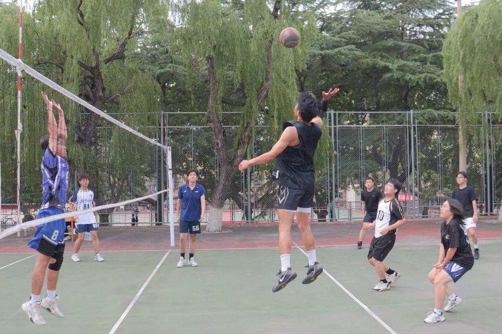 随着裁判哨声响起,比赛在双方队员的默契配合中迅速升温。发球手精准抛球、大力挥臂,排球如离弦之箭划破空气;二传手弓步下蹲、手腕轻抬,将球稳稳托向进攻位;主攻手起跳、扣杀一气呵成,排球带着凌厉的弧线直逼对方场地。师生们时而鱼跃救球、翻滚倒地,时而根据对手战术灵活变阵,比分在激烈对抗中交替上升。场下观众的欢呼声、加油声此起彼伏,将现场气氛推向顶点。