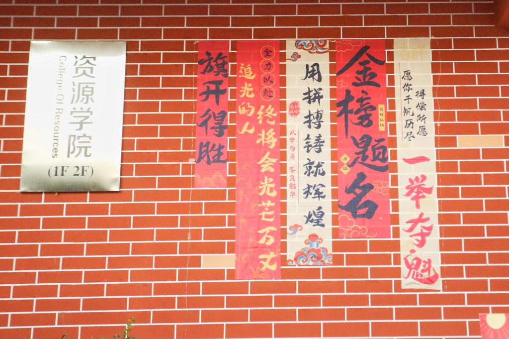 学院学生会成员在送祝福现场,为备考学子们张贴了祝福楹联,红纸墨字,相映生辉,笔锋舒展而有力:“金榜题名”的豪迈期许,饱含对学子蟾宫折桂的祝愿;“旗开得胜”的飒爽笔墨,是对备考锐气的由衷肯定;“用拼搏铸就辉煌”的恳切寄语,道尽对奋斗时光的敬意;还有“愿你所愿,一举夺魁”的温柔叮咛,将最真切的祝福揉进字里行间。这些楹联以纸墨为媒,把学院的暖意与牵挂,轻轻铺在“研”途的起点。