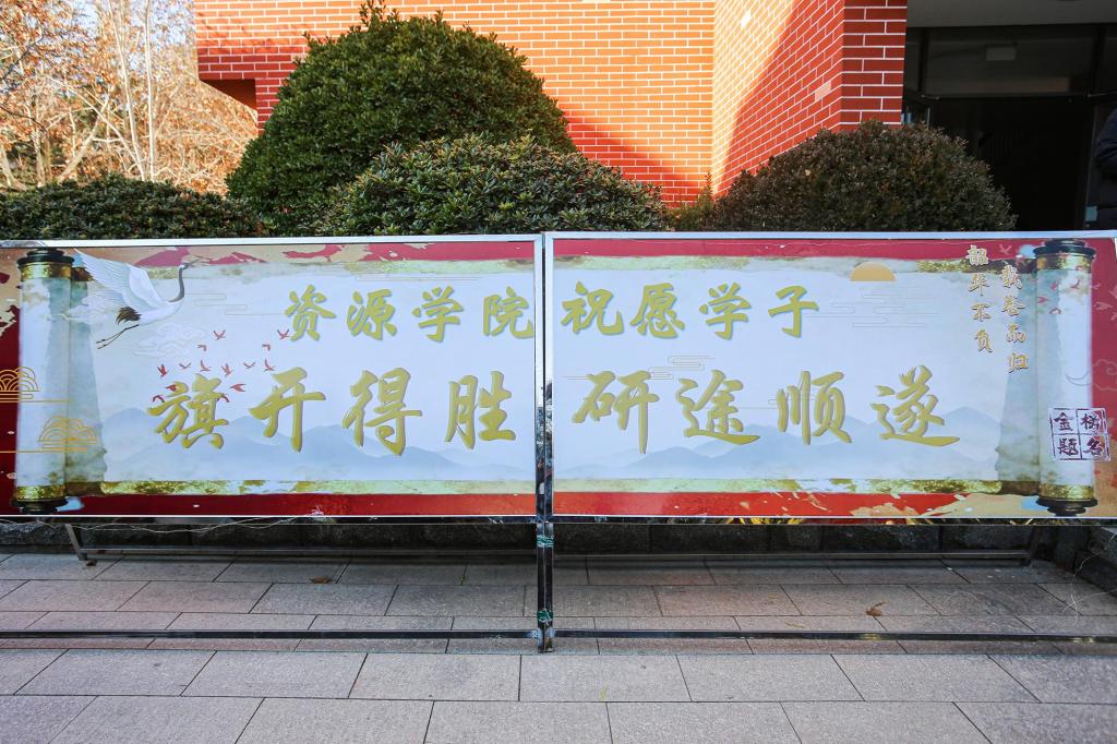 条幅高悬,祝福入心。学院在自习区主干道两侧悬挂了多幅醒目的祝福条幅。红底白字的“执笔为剑,一战成硕”“奋斗今朝,梦想绽放”等话语,如旗帜般高扬在冬日晴空下,既为备考学子营造了振奋昂扬的环境氛围,也以最直接的方式传递出全院师生对考研人的坚定支持与美好祝愿。每一条横幅都承载着温暖的期许,陪伴着学子们走过这段全力以赴的奋斗时光。