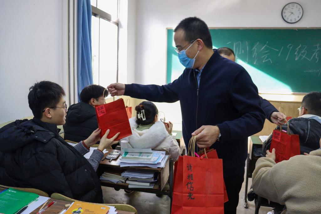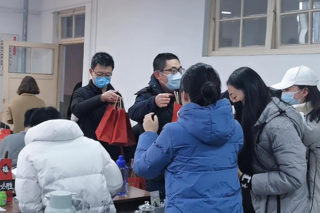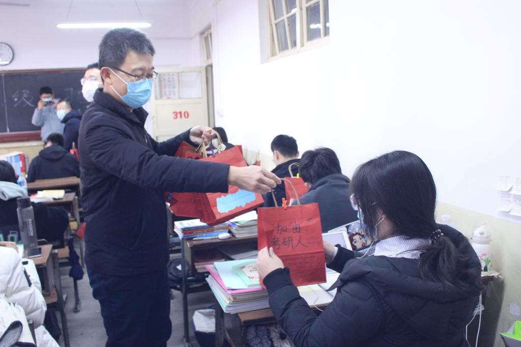 领导、全体辅导员老师手提福袋,来到考研自习室,将福袋发放到每位考研学子手中,在寒冷的冬日给考研学子们送去暖心关怀。