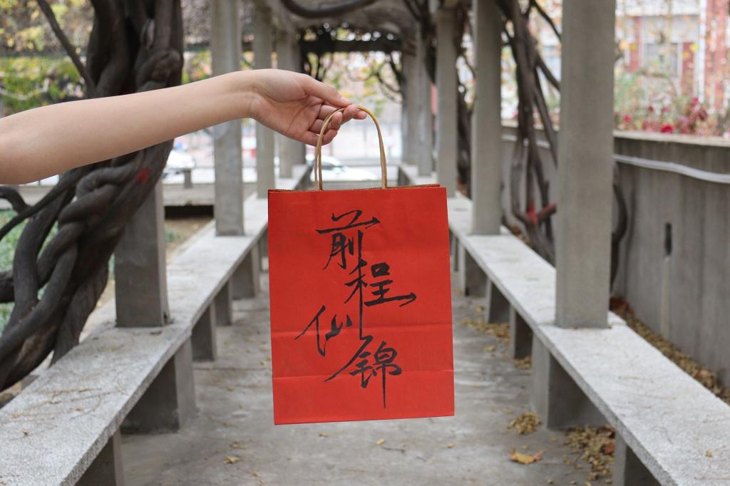 “没有横空出世的幸运,只有不为人知的努力。看着学长学姐们在心无旁骛地为自己的目标院校而拼搏奋斗,我深受感动。设计这个福袋,也希望学长学姐能够锦鲤附体,一战成硕!”当谈到为身边考研同学送祝福的初衷时,学生会主席团成员王一说道。