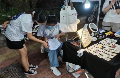 8月17日,团队成员前往潍坊市奎文区夜未坊文化街开展调研。夜未坊文化街为地摊经济热潮下的新兴夜市,据了解夜未坊文化街建立初期以非物质文化遗产的展览为主,并以此方式对风筝、剪纸、核雕、杨家埠木板年画等潍坊传统技艺进行宣传,后续衍生出以娱乐、工艺、观赏植物、日用品等为主的地摊文化。