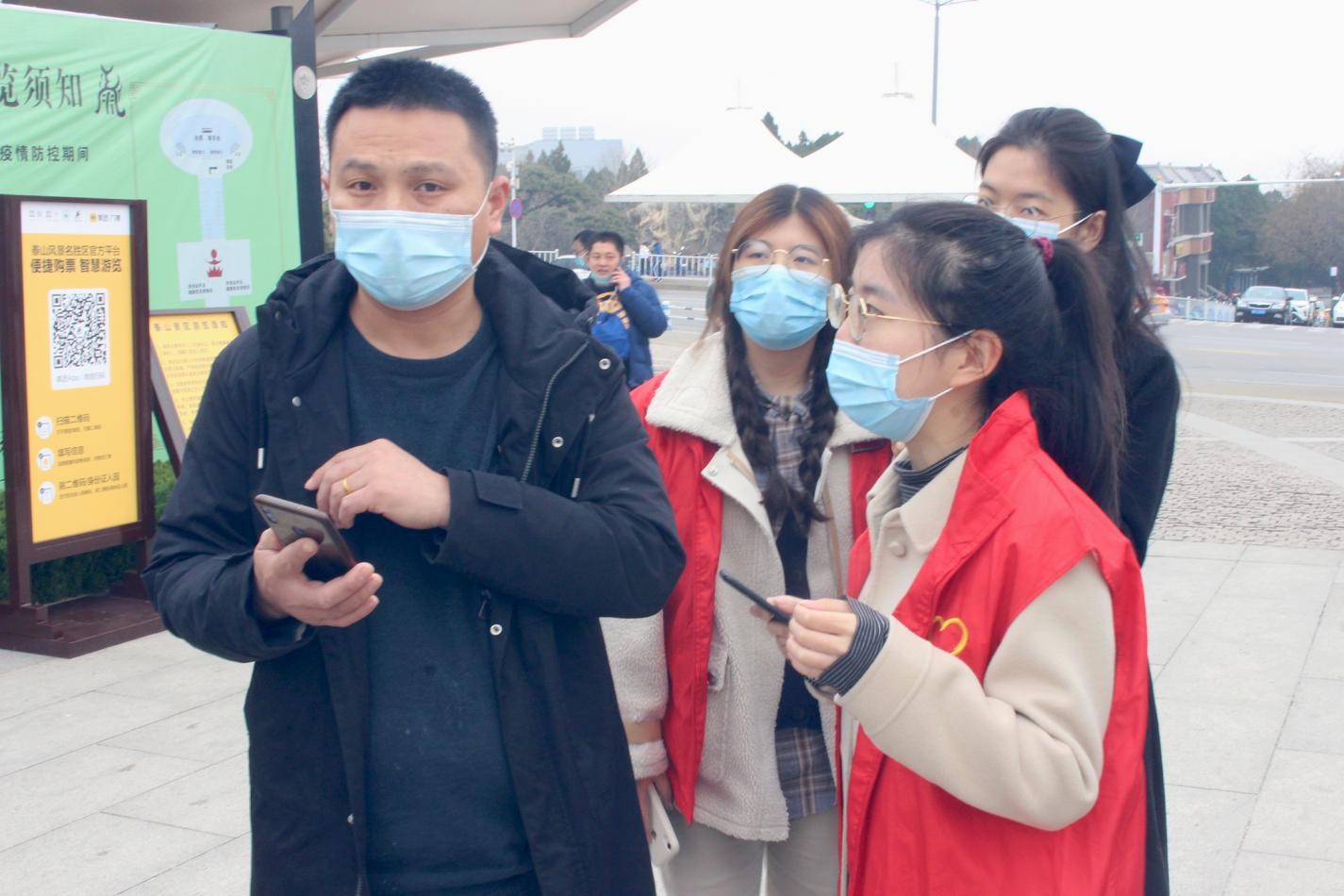 活动开始前,资源学子积极进行准备工作。通过对服务区域的实地考察以及向景区工作人员请教,充分掌握了景区志愿服务知识,有效地提升了志愿服务行动力。在工作过程中,资源学子们身穿志愿红马甲,坚守在泰山景区天外村入口,细心为游客解答问题、指引道路。志愿者们谦恭的服务态度与贴心的旅游提示得到了游客们的一致好评。
