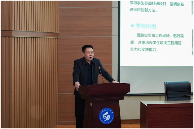 会上,王清标以“与时俱进,做好教师”为主题,从山村人、科大人、读书人、教书人、科研人、改革人、传承人七个方面畅谈教书育人的心得体会和经验做法。他指出,学高为师,新时代教师 “予人一杯,须自有一桶”,要始终处于学习状态,站在知识发展的前沿,严谨治学,不断充实、拓展、提高自己;学正为范,教师应该处处作学生的表率,用自己的实际行动来影响学生、感动学生,要有大国工匠精神,实现从教书人到教书匠的跨越,实现从教师到教育家的教育思想转变。他强调,教育是国之大计、党之大计,教师是立教之本、兴教之源,只有不忘教育初心、牢记育人使命,始终保持永不懈怠的精神状态和一往无前的奋斗姿态,才能创造无愧于新时代的新业绩。他认为,教师要坚守教书育人的初心和为国育才的忠心,既要做好学生的良师益友,又要创新方法,注重教研结合,将学生培养成创新应用型人才,真正做到因教施教,有教无类。同时,坚持做好科大文化的传承者,这就是科大教师应有的奉献精神和师德风貌。