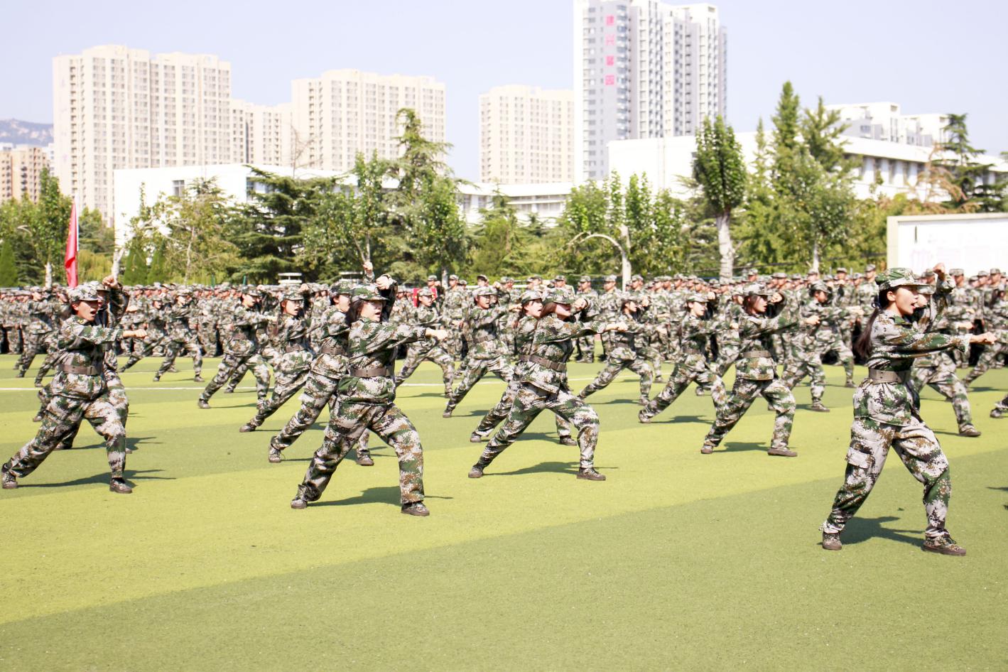 受阅方队眼神坚定,踏步整齐有力,口号铿锵,走过主席台前接受检阅,展示了资源学子坚韧不拔、奋勇进取的卓然气概。展示环节,新生三连表演军体拳,教官发出指令后,全体同学迅速进入状态,队列整齐划一,招式凌厉,气势磅礴,飒爽的英姿充分体现了资源新生朝气蓬勃、昂扬向上的精神风貌;新生一连示范战地医疗救护,将战场上的救死扶伤的情景演绎得淋漓尽致。欲漫涩