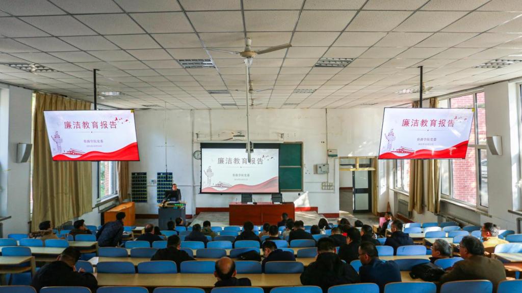 在1A107教室开展全体教职工廉洁教育。学院党委书记高尚宇主持会议,副院长李楠作专题报告,全体教职工参加。