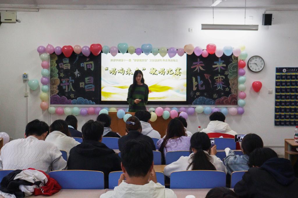 在2号楼207教室举办第十一届“青春竞技场”文体素质系列活动之“唱响未来”校园歌唱比赛。活动由校区及学院学生会各部门代表担任评委,共吸引23名同学登台参赛。