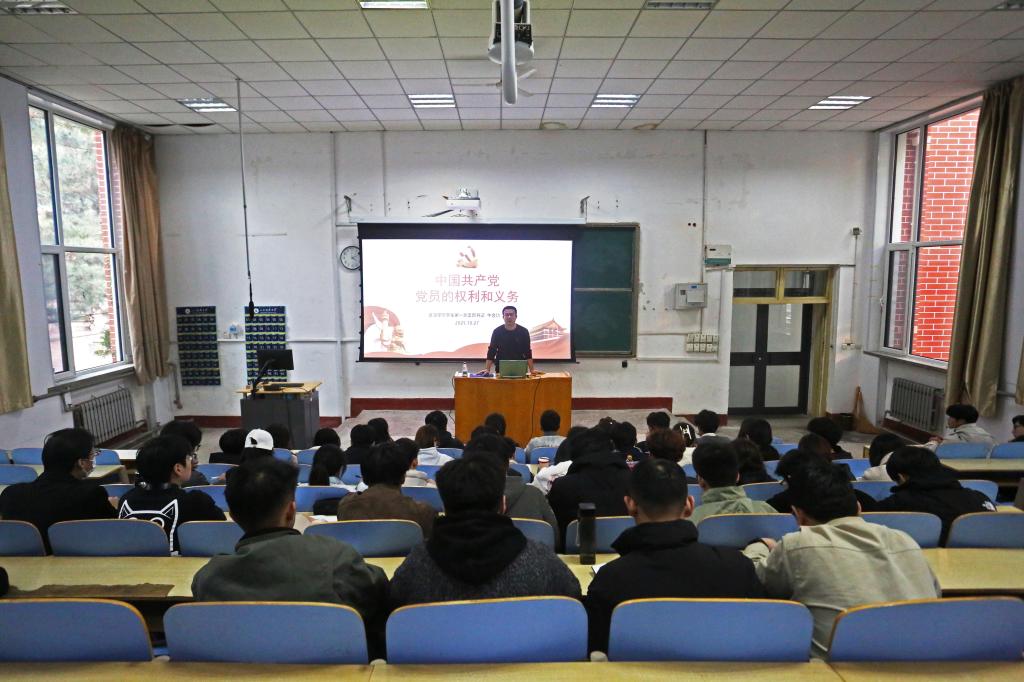 10月27日,欲漫涩 学生第一党支部书记、辅导员牛会功在1A107教室为学院第43期入党积极分子讲授“中国共产党党员的权利和义务”专题党课。