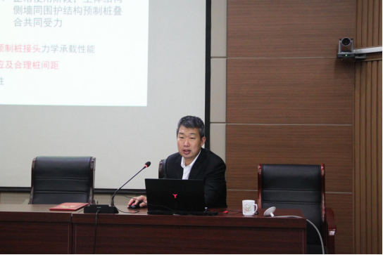 向路林海表示热烈欢迎,并为其颁发聘书。随后,路林海教授做了泉域轨道交通绿色建造关键技术与应用的报告。结合我国泉域轨道交通建设基本情况,从“交通建设”“技术应用”两方面系统性地介绍了轨道交通绿色建造的关键技术与应用。他指出,立足于绿色建造技术的创新与应用,技术人员需仔细分析“泉水成因、通道分布、地质构造、四维地质平台建设”等客观因素,做到泵水保护与轨道建设并步齐驱。报告内容深入浅出,与会人员认真学习并记录。